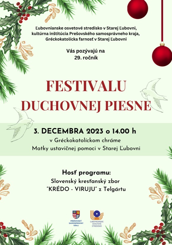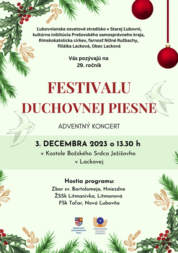 Ľubovnianske osvetové stredisko v Starej Ľubovni Vás pozýva na Festival duchovnej piesne, ktorý sa uskutoční 3. decembra 2023 v Starej Ľubovni a v Lackovej.