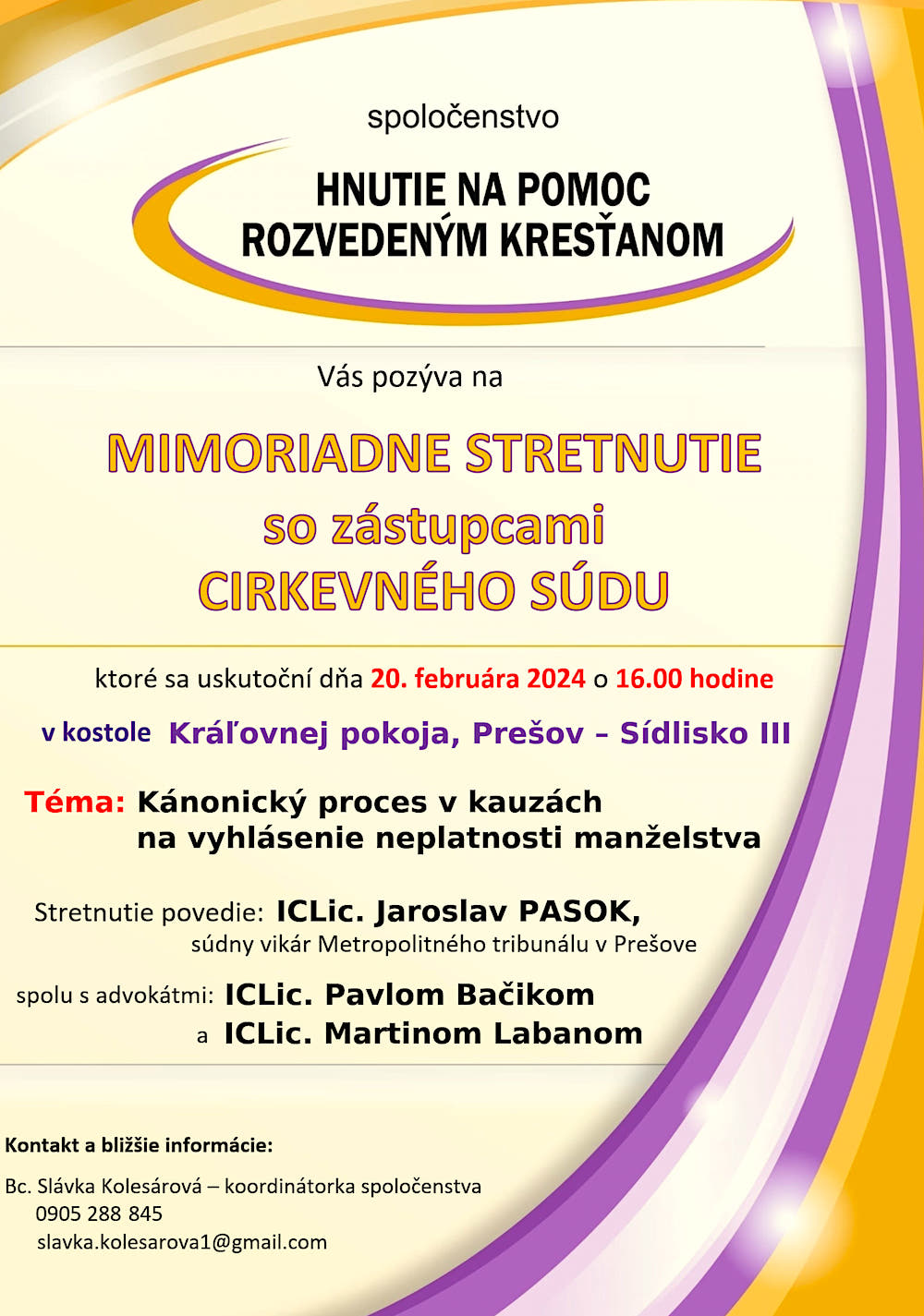 spoločenstvo Hnutie na pomoc rozvedeným kresťanom Vás pozýva na MIMORIADNE STRETNUTIE – so zástupcami Cirkevného súdu, ktoré sa uskutoční dňa 20.februára 2024 o 16.00 hodine